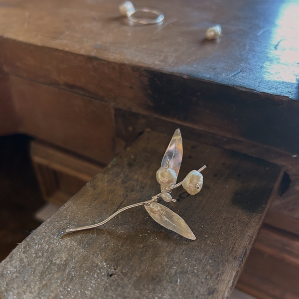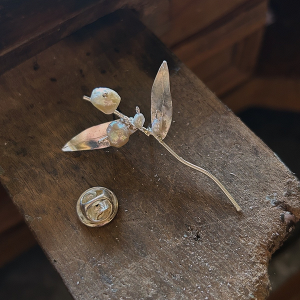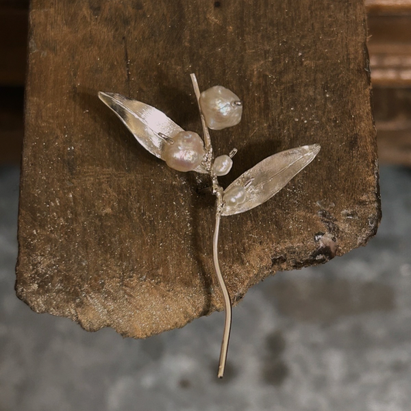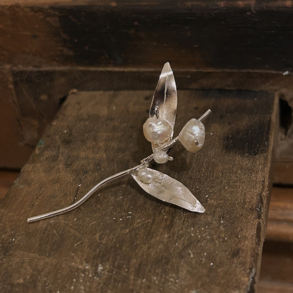 Prendedor realizado a mano en plata 925 con forma de ramita con perlas de diferentes tamaños.